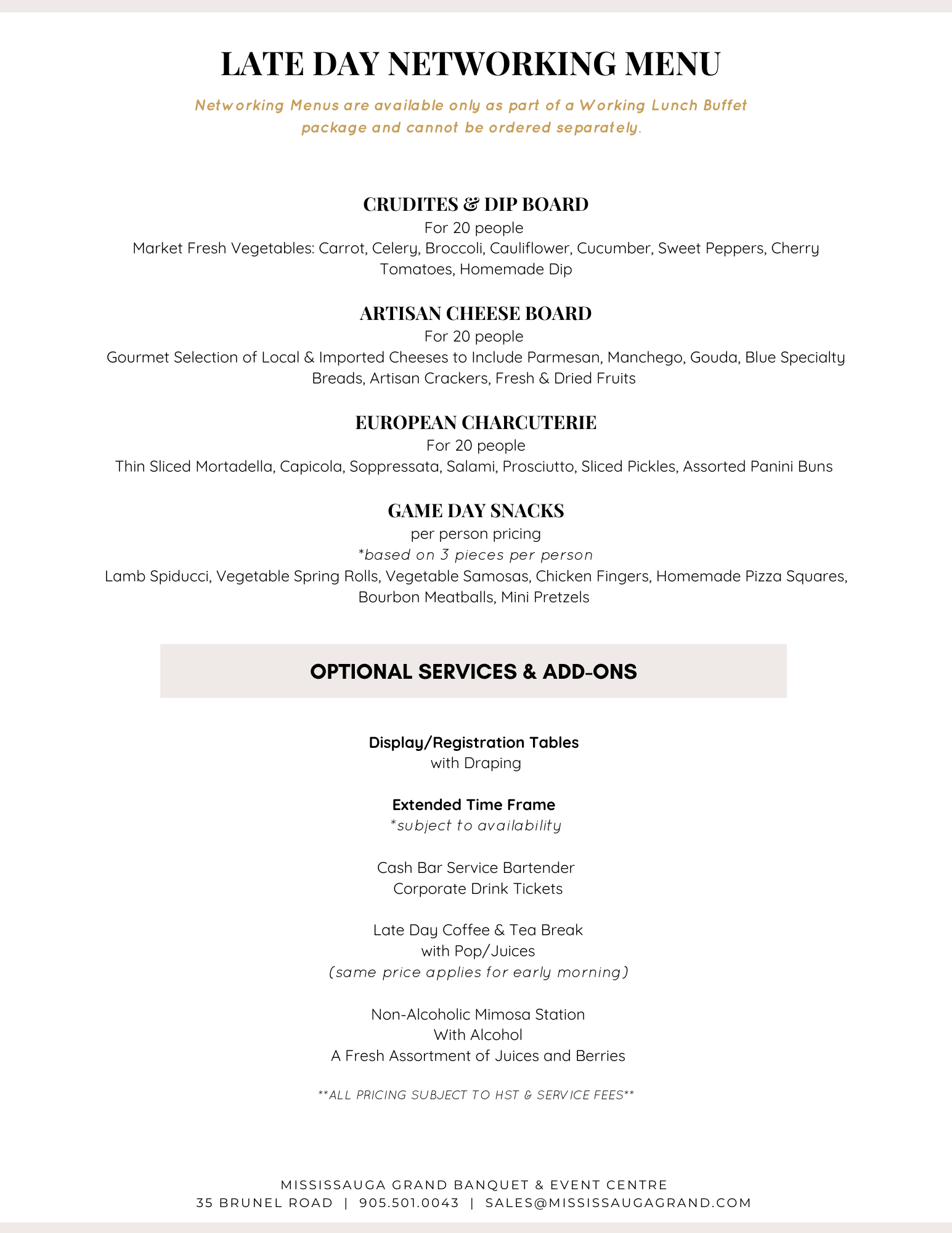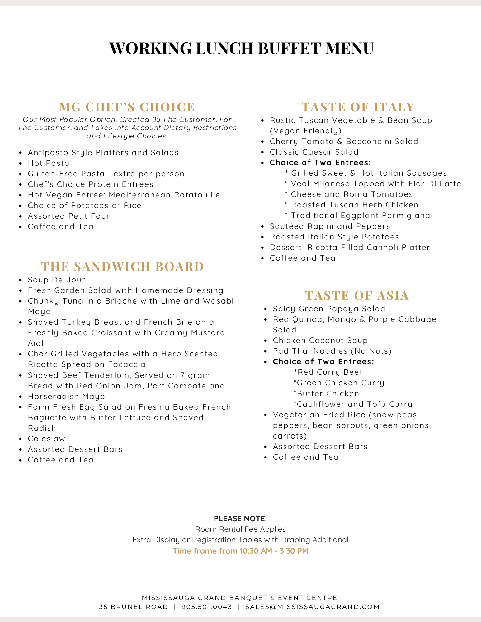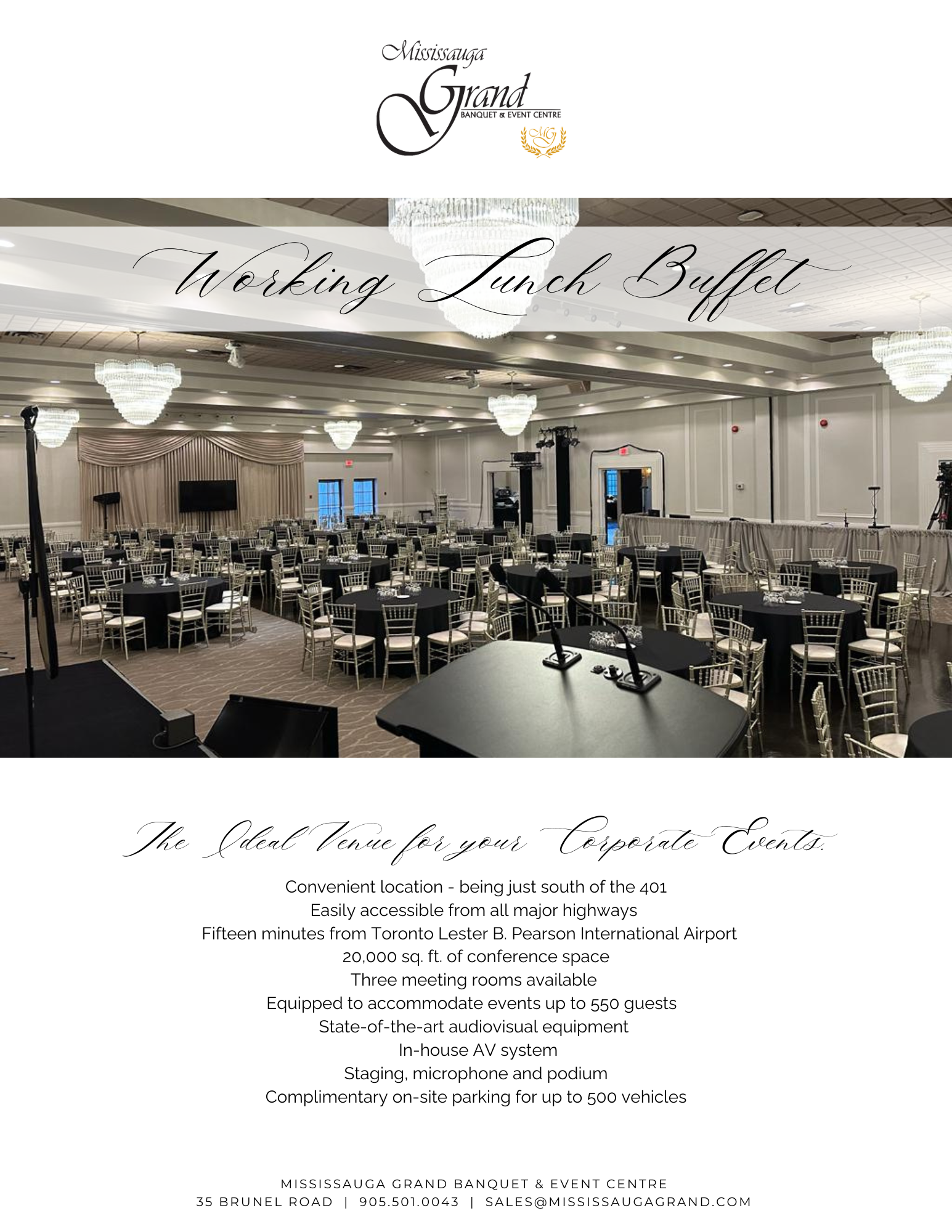 The Mississauga Grand Banquet & Event Centre offers a professional and organized setting for corporate working lunches. Guests can enjoy fresh, high-quality buffet options, attentive service, and an elegant environment designed for comfort and efficiency.