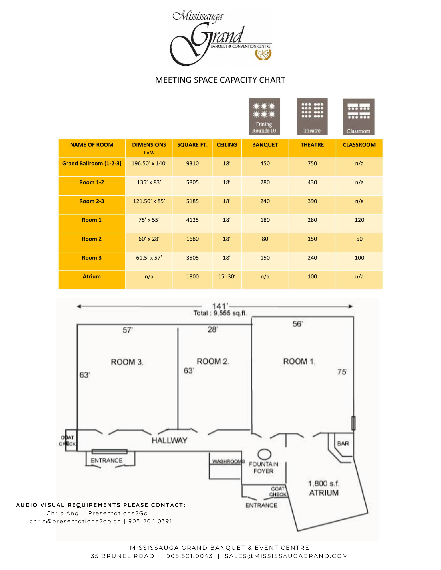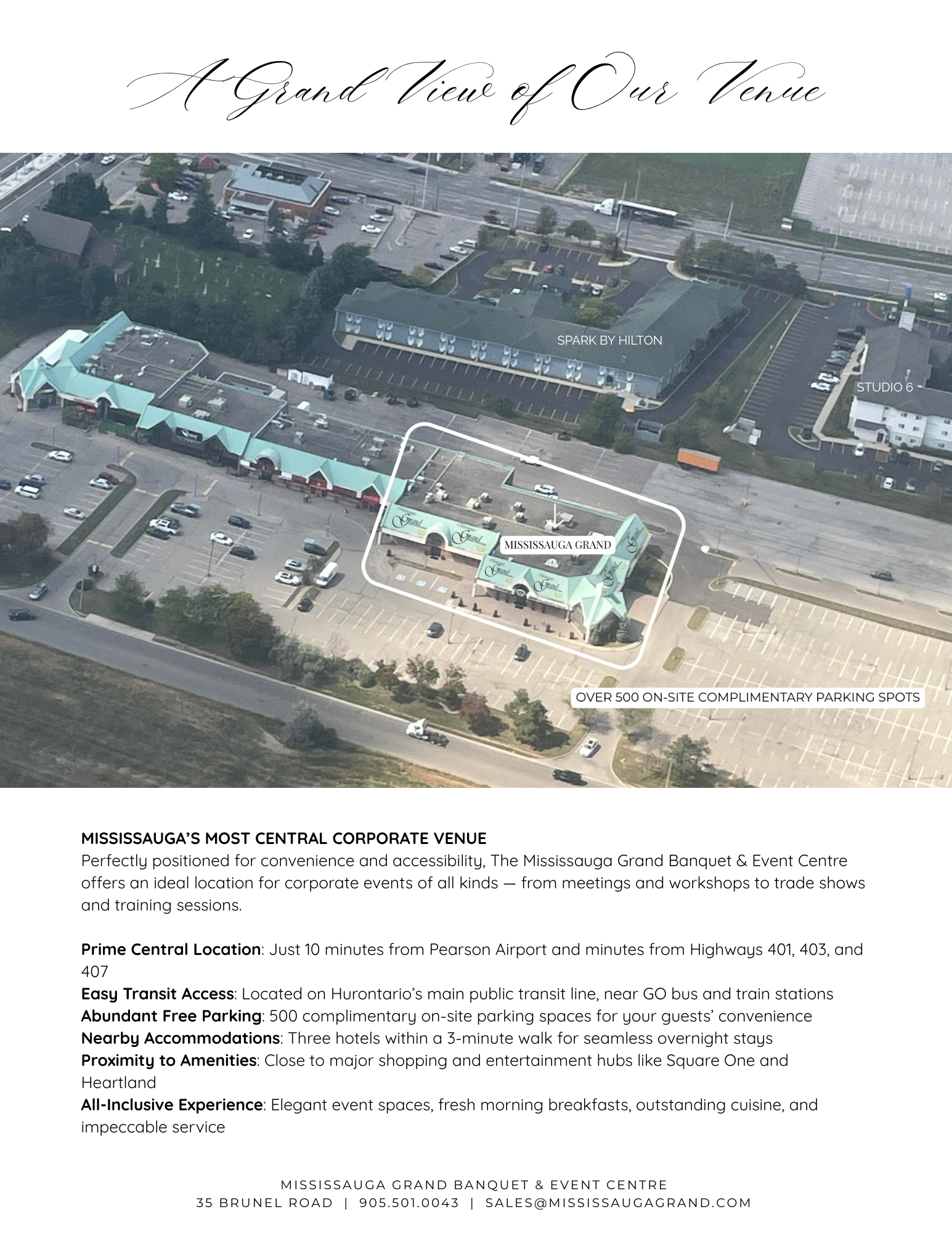 Our location allows for simple highway access to and from your event and is minutes from major shopping and entertainment destinations, including Heartland Town Centre and Square One Shopping Centre.